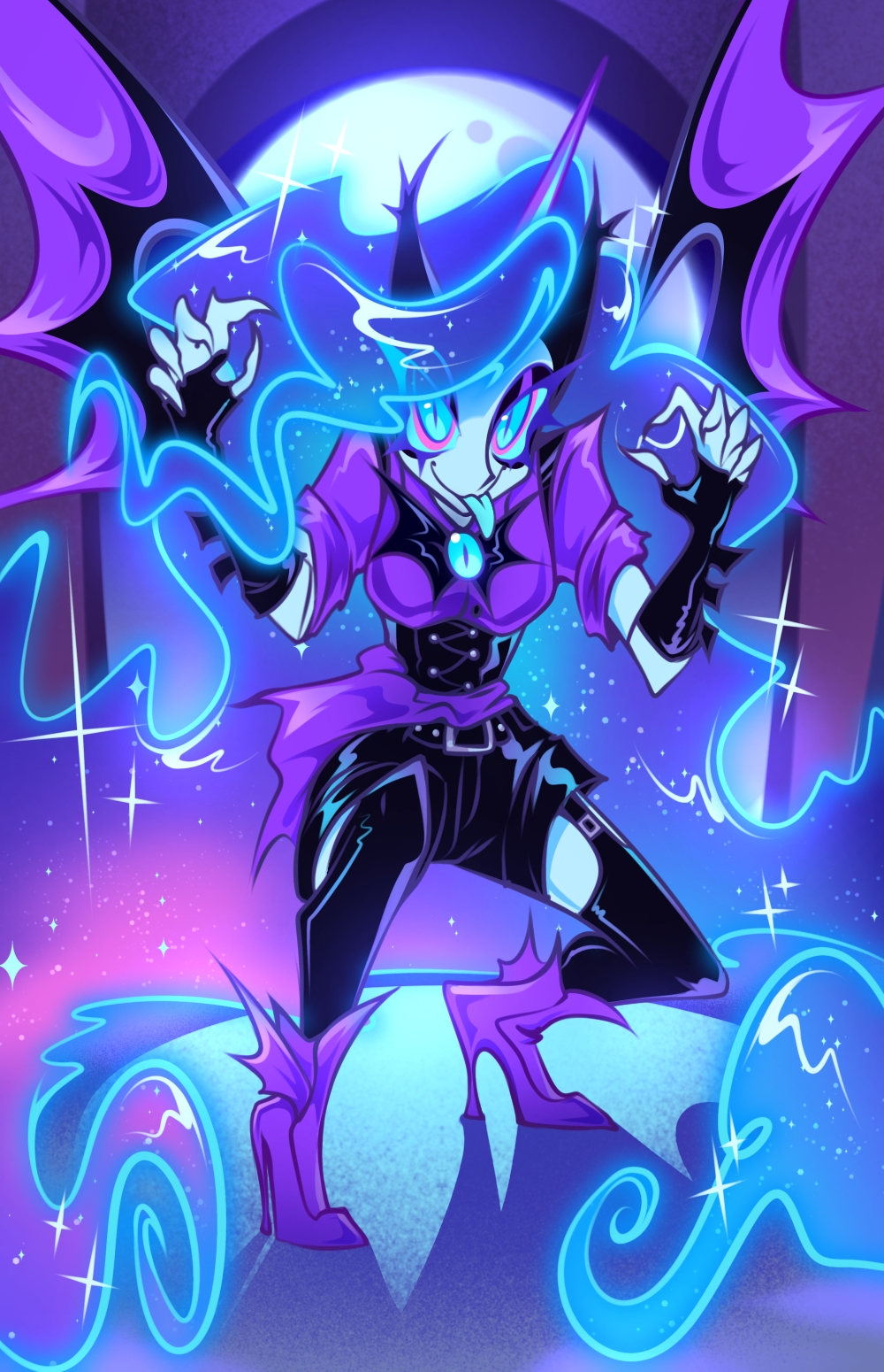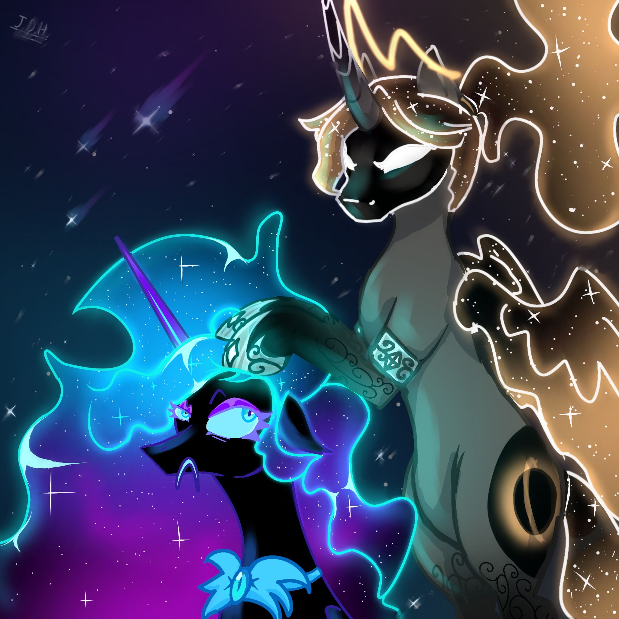 ✦ В своей обычной форме, она выглядит как чёрный аликорн двухметрового роста, с фиолетовым рогом, крыльями дракона и градиентом на ногах. Её грива похожа на космос, но на самом деле является субстанцией из чистого хаоса, из которого когда-то состоял её дух.