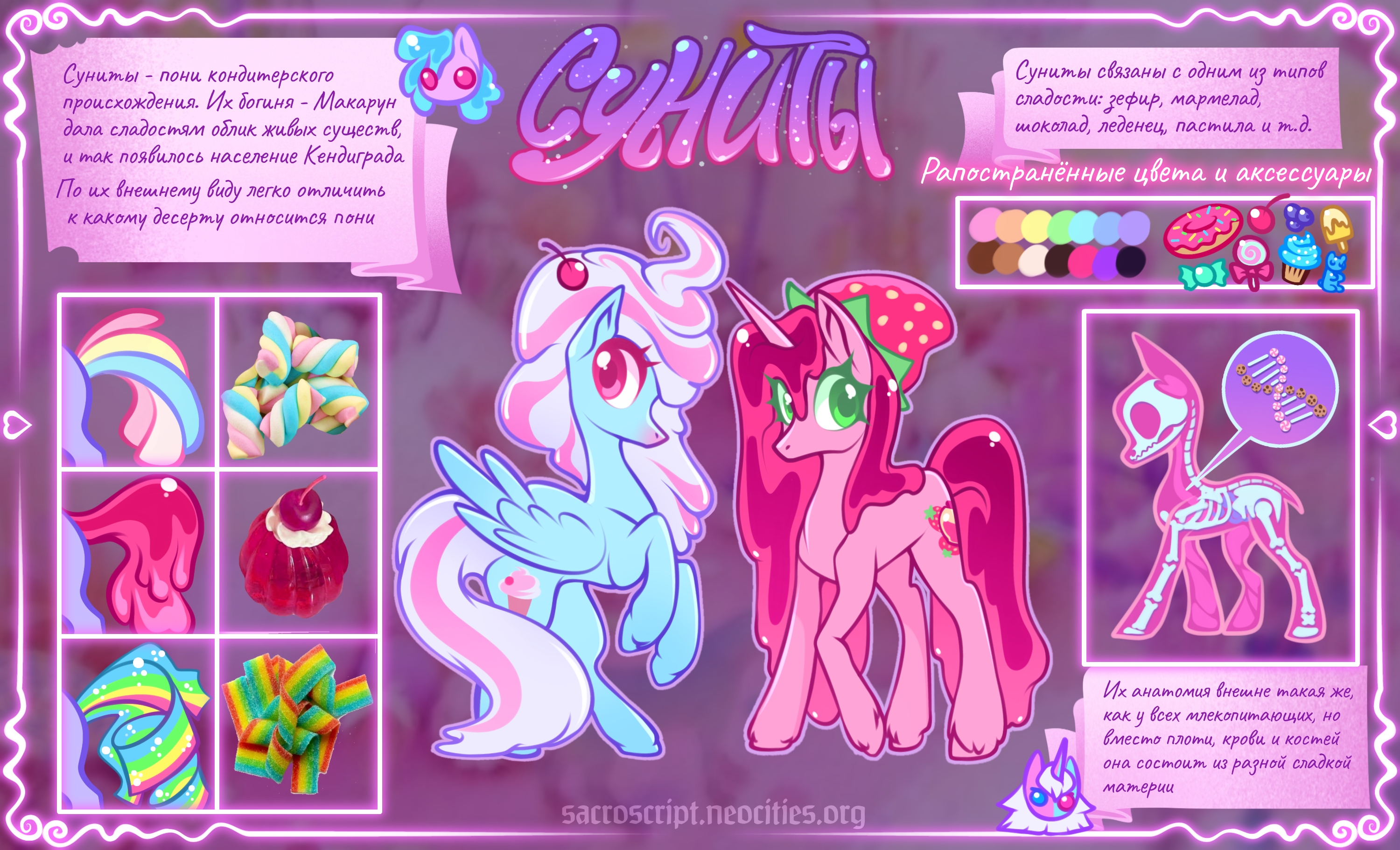 ✦ Суниты - это вид пони которые сделаны из любых сладостей, будь это карамель, мята, мороженое или желе. Их внешность зависит чаще всего от места проживания, но если идёт скрещение двух сладостей то получится определённый десерт.